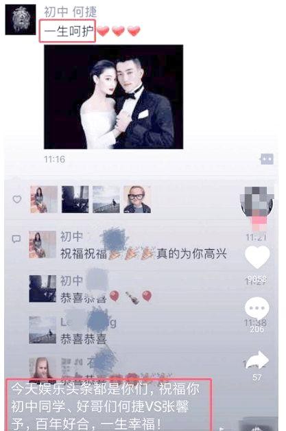 除了微博,网友们还挖掘出了张馨予丈夫何捷的朋友圈。近日,何捷的一位初中同学在抖音上公开了他昨天发布的朋友圈动态,迅速吸引了大量网友的关注。在这条动态中,何捷分享了一张与张馨予的甜蜜婚纱照,并配以“一生呵护”的深情誓言,满溢着爱意。