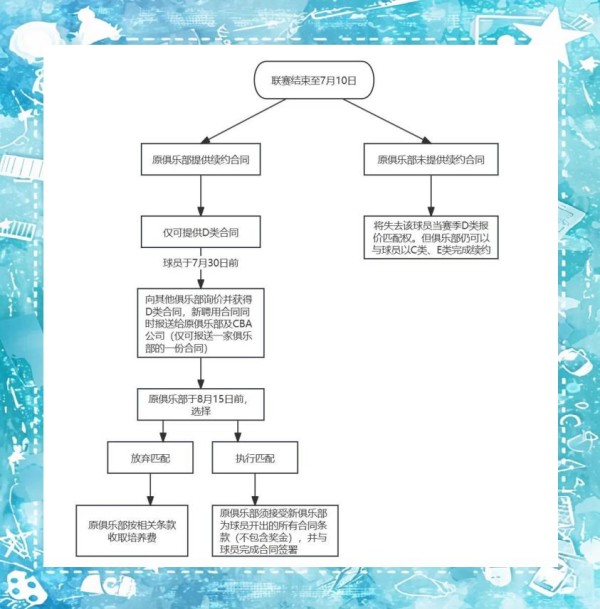 A1和A2合同分适用,原俱乐部享有签约权及具体匹配规则。A类合同作为新秀合同,分为A1和A2两种类型,分别适用于俱乐部自行培养的球员和选秀球员。当A1类合同的球员到期后,原俱乐部享有该球员的独家签约权。若俱乐部选择续约,必须在书面通知的同时,向球员提供一份基本工资涨幅至少达到100%的B类合同。若球员拒绝签署,俱乐部则保留独家签约权直至其放弃或转让。