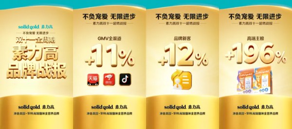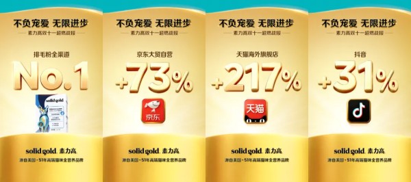 凭借创新产品实力与热点话题,在双十一购物节期间,Solid Gold素力高电商GMV全渠道实现同比增长11% 14,新客同比增长12% 14。旗下高端主粮同比增长196% 14,排毛粉更强势霸榜全渠道No.1 14。此外,京东大贸自营销售实现同比增长超73% 14;天猫海外旗舰店销售同比增长217% 14;抖音渠道销售同比增长31% 14。
