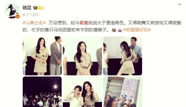在《以美之名》的剧宣活动上,姚晨与贾静雯共同挑战了《李羲承进行曲》的舞蹈。然而,她们发现自己的四肢似乎并不受自己控制,这种尴尬情况让姚晨在采访中苦笑表示,如今的剧宣活动似乎比塑造角色还要困难。