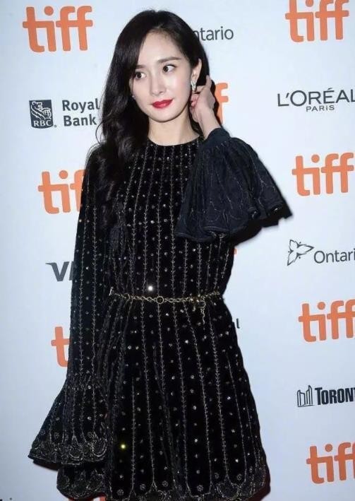 同样是黑色裙子,杨幂的这件丝绒裙非常优雅的感觉,裙子上的金色丝线更是让这件裙子闪闪发光,搭配同样的金色腰链,不会显得突兀,而且和这一身的优雅温暖融为一体。