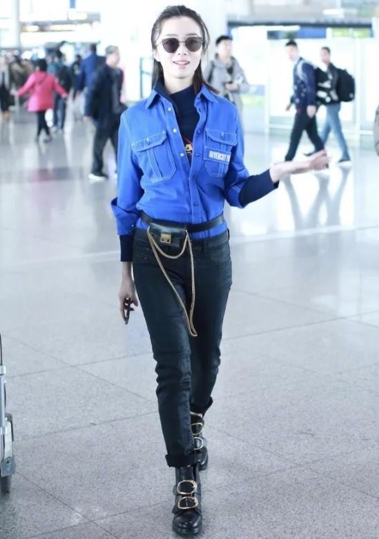 不要以为只有裙子才能搭配腰链,裤装搭配腰链,又帅又美,蓝色工装上衣搭配牛仔裤,佟丽娅的这一身一下子就变成了酷女孩的感觉了,而且腰链还显得腿长,大家也可以这样试试哦!