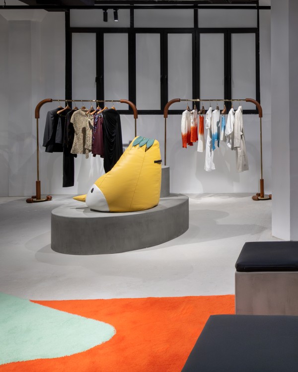 备受瞩目的 “The Ark”限量动物座椅系列首次亮相,灵感源自经典 Sacco 沙发涵盖公鸡、马、熊猫及蛇等造型,将功能性与趣味性结合。此外,品牌特别打造”MagicNews”空间,来宾可翻阅全新推出的 Bottega Veneta Fanzine 杂志,深入了解该系列的创作过程及设计灵感,并通过定制涂色书、彩色铅笔、贴纸和翻页书等互动元素感受设计巧思。同区域还放映了由导演LarsTimmerman 操刀的 2025 夏季广告大片,超模 AnokYai、李承嫒与动画化的动物座椅同框,生动诠释季节主题