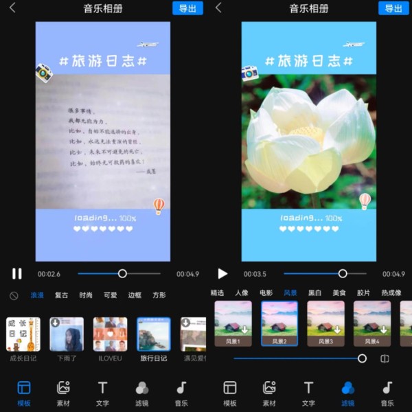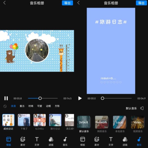 在首页点击“音乐相册”功能,随后上传需要制作的图片素材,即可在操作页面选择喜欢的音乐相册模板来美化视频。同时还可以利用“滤镜”、“音乐”等按钮更进一步丰富音乐相册内容。设置完成后点击“导出”按钮即可完成制作。