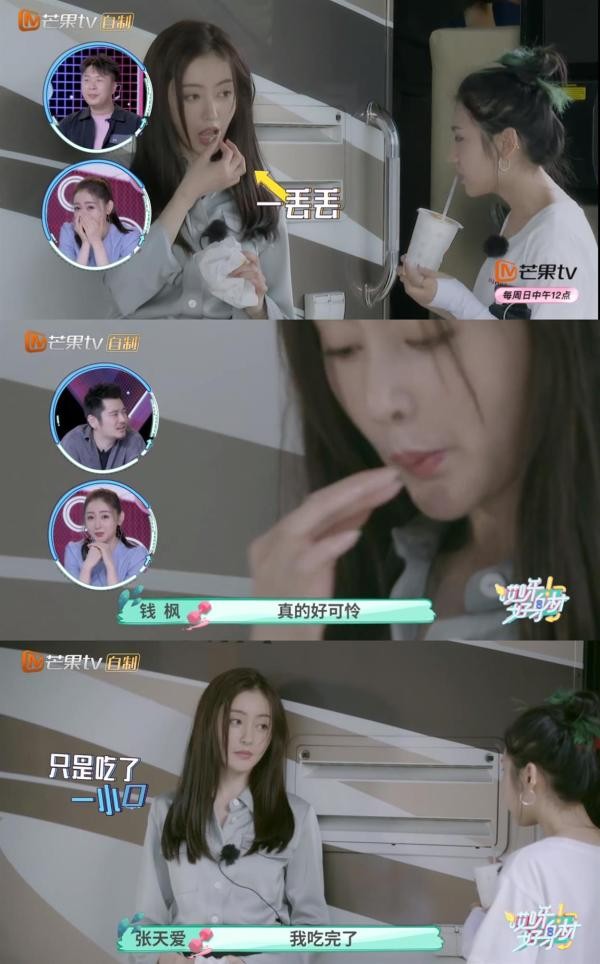 比如少吃。张天爱的早饭,也就一个鸡蛋加蔬菜沙拉,其实并没有吃几口,美其名曰“少吃多餐”;在片场帮工作人员叫了炸鸡,但她看着别人吃,假装自己已经吃了,美其名为“意念饮食”,最后在诱导下,也只吃了一小丢丢。