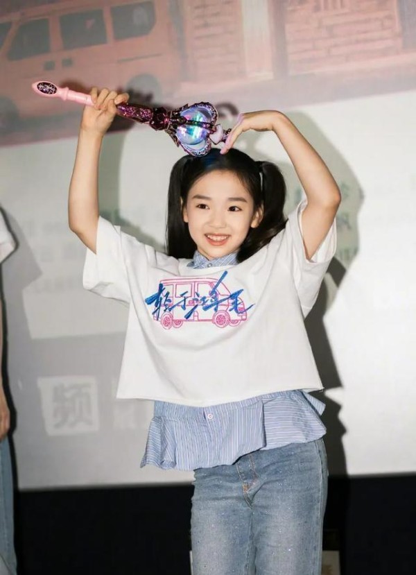 你想,小酒窝扎着两个长长的双马尾,穿着蓝色的小衬衫,又搭配了牛仔裤,再加上那身电影路演的T恤,完全巴适得很,哪像个普通的小姑娘,完全就是那种甜美可爱的模样