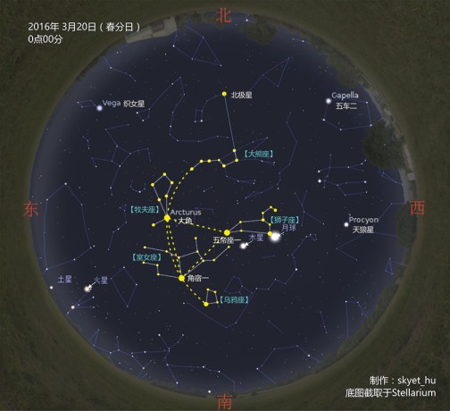 长蛇头部的东北,是著名的狮子座.它是春夜星空最辉煌的中心.狮子星座的主星,中名轩辕十四,是处于黄道上的一颗一等星.有时有明亮的行星走近时,就非常好看了.
