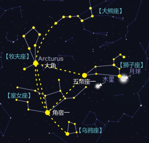 春季星空最显著的是“春季大三角”。春季大三角指春天高挂在天空的三颗亮星,它们排列而成三角形状。三颗亮星分别是狮子座的五帝座一、室女座的角宿一及牧夫座的大角星。 [2]