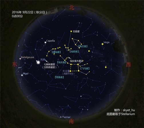 天顶偏东是飞马座.仙女座就是在飞马座东北的一字形星座.仙女座北面是W形的仙后座.仙后座西面是仙王座,东面是英仙座.