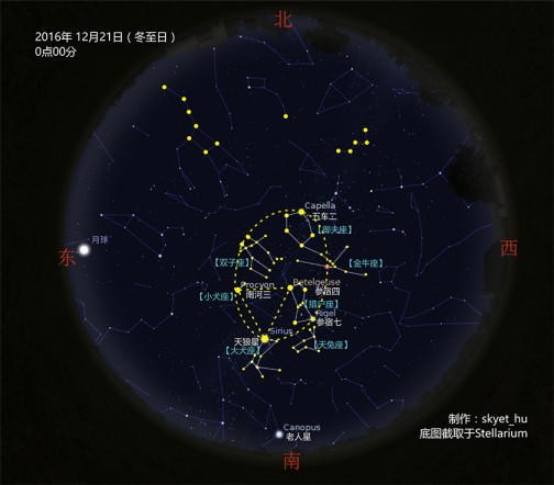冬天,是一年四季中亮星最多的季节,有不少星座都非常容易识别。最引人注目的,当然是高悬于南方天空的猎户座:夹在红色亮星参宿四(猎户座α星)和蓝白色亮星参宿七(猎户座β星)之间的三星(猎户座δ、ε、ζ)颇为吸引人。顺着三星向南偏东寻去,可找到全天最亮的天狼星(大犬座α星)。在参宿四的正东,另有一颗亮星南河三(小犬座α星)。参宿四、天狼星和南河三组成著名的“冬季大三角”。 [2]