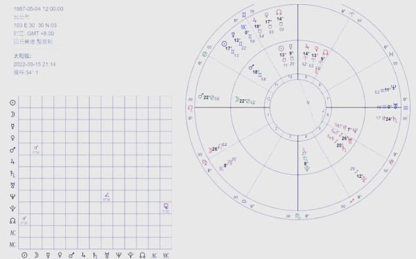 我们进一步探讨太阳弧的影响,发现冥王星在5小时4分等于MC,即事业宫,这预示着事业上可能面临终结或重大变革。同时,海王星在7小时8分与天王星在7小时6分相刑,这冲击了代表婚姻的7宫,暗示婚姻关系可能出现问题,无论是离婚还是合作破裂,都可能成为现实。此外,火星在4小时9分与月亮在12小时12分相合,这预示着可能涉及法律纠纷,甚至有牢狱之灾的风险。