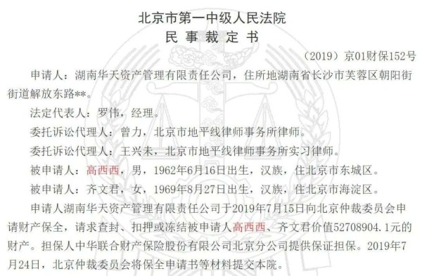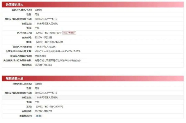 据中国执行信息公开网显示,因高希希旗下霍尔果斯嘉乐股权投资管理有限公司(以下简称霍尔果斯嘉乐公司)与皮某的纠纷一案,高希希(原名:高西西)目前被广州市天河区人民法院列为失信被执行人,执行标的约3600万元。除被列为失信被执行人之外,高希希还被法院立案执行限制消费。