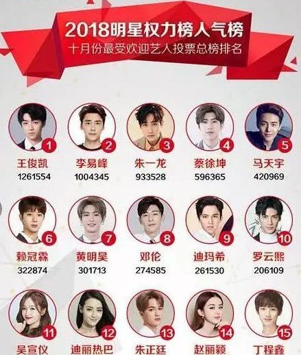 现在新晋的小鲜肉赖冠森和歌手转为演员的马天宇一个在第六一个在第五,前几名都有一个特点也是现在娱乐圈很流行的,就是都是小鲜肉,毕竟现在小鲜肉的市场还是要多一些。前四名的位置同样还是小鲜肉,蔡徐坤、朱一龙、李易峰、王俊凯。王俊凯是第一名,可以说是现在的人气王。