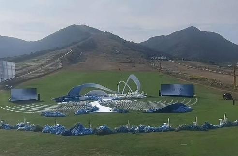 天气不错,布置得也挺洋气,主色调是蓝色,满眼都是花。后来有人说,光这些花,就花了三十多万。