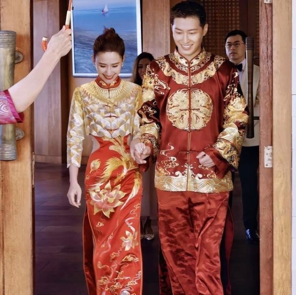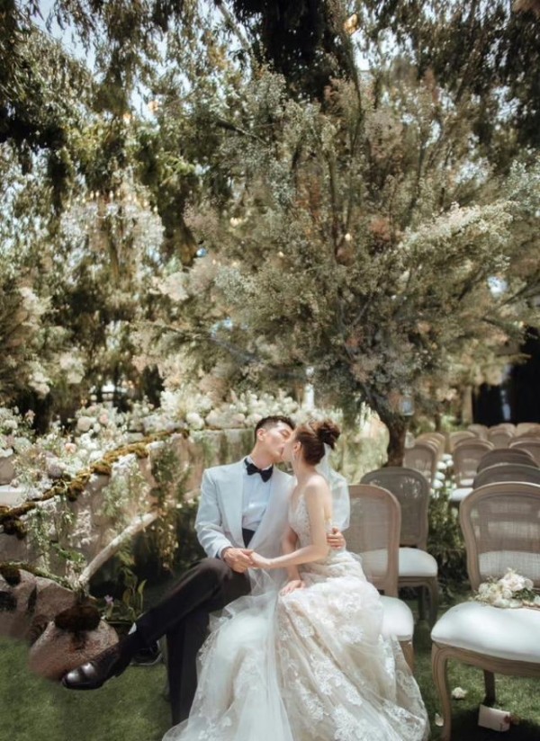 更打动我的是那些藏在细节里的心意。婚礼西侧的花路,窦骁特意要求顺着步道楼梯铺设,让新娘走过的每一步都置身花海。应对巴厘岛突如其来的阵雨,他连遮雨设备都提前规划好了。最绝的是,他在自己的礼服上绣了个小“金点”——那是两人第一次约会的纪念符号。这种只有彼此懂的暗号,比任何昂贵的珠宝都珍贵。