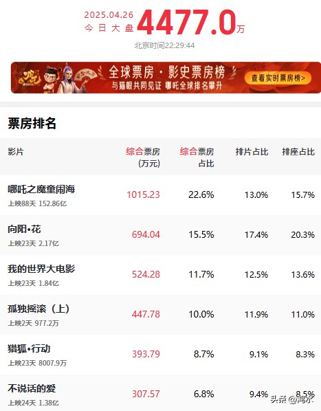 电影观察:最近几天,《哪吒之魔童闹海》又又登录日票房冠军了,包括唐探1900每天都有几百万票房,射雕英雄传每天也有70多万,而赵丽颖主演的新片《向阳花》的日票房却只能排名第二,原因是什么?