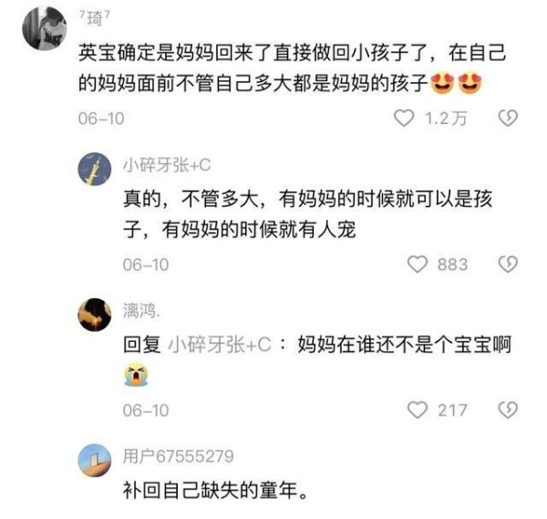 《太奶奶》以容遇(李柯以饰)教授为主角,讲述她意外去世后穿越到70年后,成为一名18岁的高中生;晃眼间,她的儿子“英宝”已成为70多岁的纪氏董事长。剧中,在外人面前的纪舜英,是短剧里常见的豪门“霸总”;面对母亲时,却成了爱耍小孩脾气的“英宝”,不仅会向18岁的母亲撒娇,还会像追星的年轻粉丝一样,为母亲举灯牌、“打call”。在豆瓣上,这部短剧评分7.2。有观众留言:“纪老头子一口一个‘妈妈’真的太有反差感了,二人初相见时也很催泪,当暮年时分,长辈尽去,谁不想再看一眼最脆弱的时候,庇护自己长大的母亲呢?”