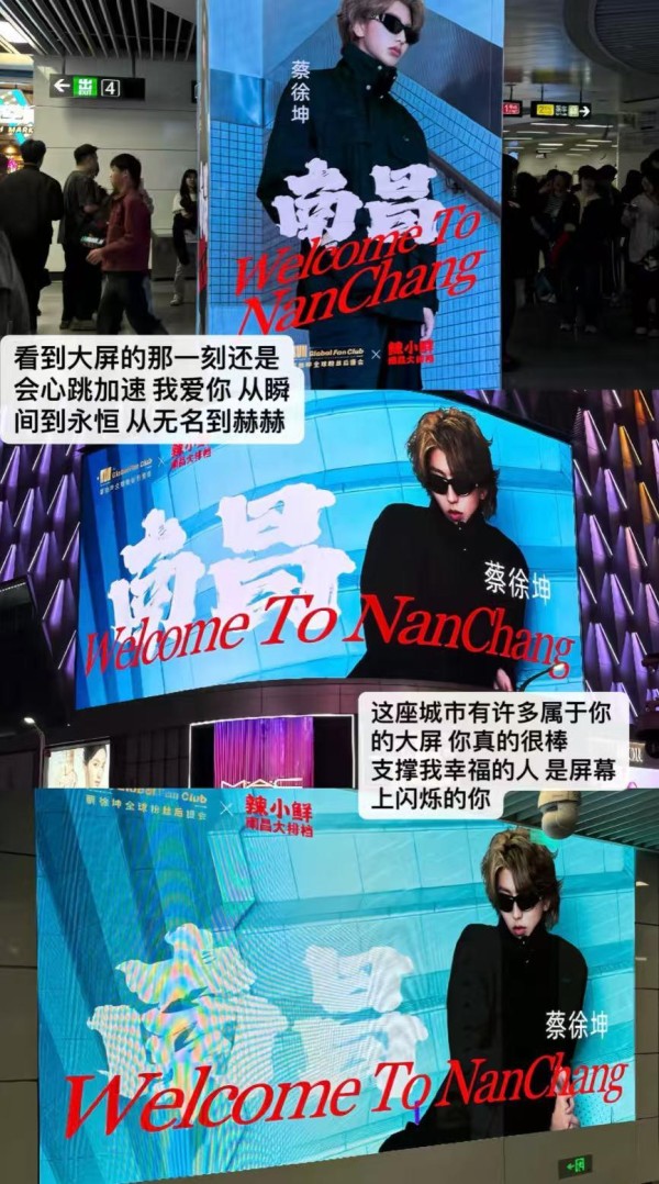 当蔡徐坤登台的那一刻,现场气氛被推向了高潮。粉丝们的尖叫声与《情人》的大合唱交织在一起,声浪震耳欲聋,网友们纷纷调侃“南昌秒变‘坤城’” 。活动现场,粉丝们的热情不仅体现在呐喊与歌声中,还体现在精心策划的应援活动里。他们自发组织“人形应援墙”,商场的每一层都站满了手持荧光棒的支持者;设置AR打卡点、歌词灯光秀,甚至用无人机编队拼出蔡徐坤头像,将沉浸式应援场景打造得淋漓尽致 。