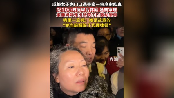 成都女子家门口遇害案一审庭审结束,经10小时庭审后休庭 延期审理,紫雅妈妈走出法院门口激动晕倒,嘴里一直喊:她是故意的,“她当庭解除了代理律师”。 (来源丨风芒新闻)