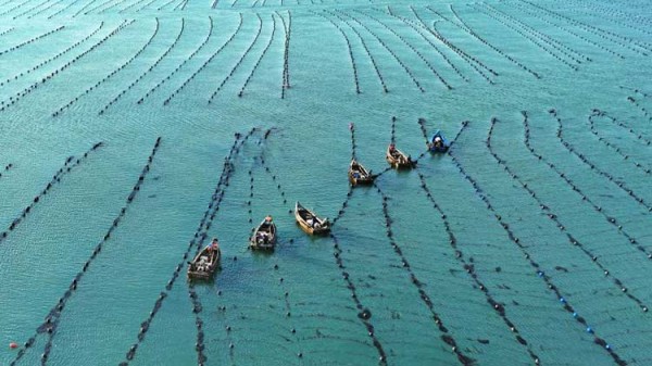 11月19日,在山东省荣成市爱伦湾海带养殖区,工人进行海带播苗作业(无人机照片)。眼下,山东省荣成市海带播苗作业全面展开,养殖工人们抓紧时间进行夹苗、播苗等作业。眼下,山东省荣成市海带播苗作业全面展开,养殖工人们抓紧时间进行夹苗、播苗等作业。