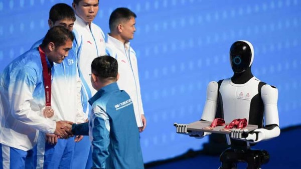 11月17日,在田径项目赛事开始前的暖场活动中,机器人和吉祥物喜洋洋、乐融融在广东奥体中心体育场赛跑。11月17日,在田径项目赛事开始前的暖场活动中,机器人和吉祥物喜洋洋、乐融融在广东奥体中心体育场赛跑。