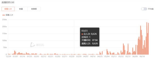 5 月,该直播间观看人数开始飙升,到 6 月中旬之后几乎每场直播的观看人次都能达到百万级,巅峰甚至能超过 230 万人次的场观。