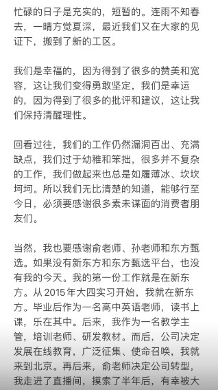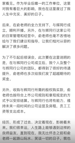 "收购与辉同行所需的股权购买款,俞老师也按符合上市公司规则和章程规定的方式予以安排结算。与辉同行也将有能力,维持未来一段时间的公司运营及房租、员工工资等支出成本。”董宇辉表示。