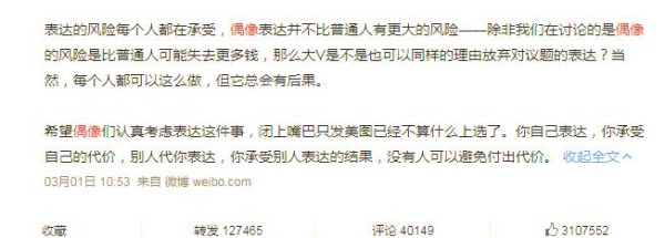 偶像选择沉默不代表放弃责任,而是另一种需要承担后果的选择,特别是在处理粉丝行为影响时。部分偶像选择沉默并非完全出于无奈,而是他们主动放弃了表达的权利。这种沉默并非意味着可以摆脱责任,而是他们做出的另一种选择,同样需要承担相应的后果。因此,当偶像们出于利益考量,在任何情况下都不愿表达自己的观点和立场,从而回避社会责任时,他们就只能在类似事件中默默承受由粉丝带来的负面影响。在这种情况下,为自己的行为负责就显得尤为重要。