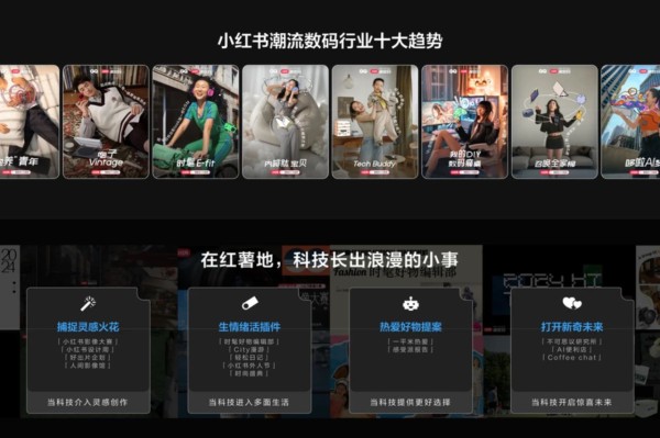 平台动态方面:近日,小红书在深圳举办 2024 潮流数码行业峰会,会上联合《GQ》首次发布《十大数码「潮」人趋势图鉴》以及《五类潮数码生活方式人群》并根据行业特性拆解数码营销新解法。期间小红书也公布了全新升级的数码行业 IP 矩阵。根据数码行业十大趋势以及站内特色内容,小红书推导出「捕捉灵感火花」「生活情绪插件」「热爱好物提案」「打卡新奇未来」四大营销场景及场景下的 IP 系列,帮助品牌触达核心人群,实现高效全链路营销。