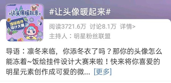 11月17日微博出现这样一个话题,:让头像暖起来”,各家粉丝们都纷纷参与,毕竟除了排名和奖项之外,最重要的是选中了就可以在微博中展出,到时候就会有机会成为正式的头像挂件。