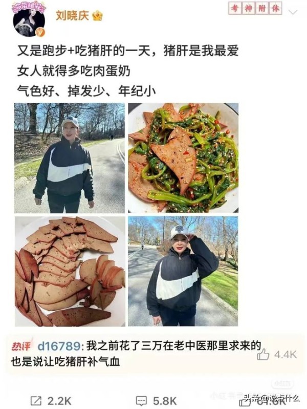 猪肝当补品:刘晓庆最喜欢吃猪肝,一周要吃3-4次。别人嫌腥的猪肝,她吃得倍儿香。还怼过网友:“你们天天喝枸杞水,不如来盘爆炒猪肝实在!”