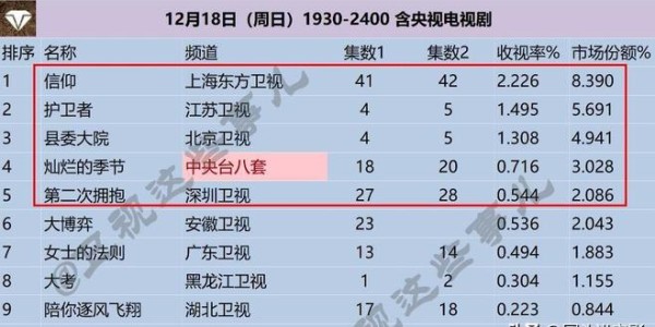 根据“63个城市”收视率数据,12月18日晚国产剧热播收视率排名前五位分别为