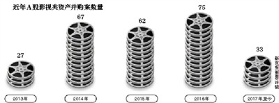 在一批影视类公司相继登陆资本市场后,近年来上市公司对影视类资产更是偏爱不已。Wind资讯数据显示,2013年全年,A股市场只披露了27起标的为影视类资产的收并购,到2014年这一数字增加到67起,2015年、2016年则保持在这一水平,全年涉影视类资产收并购分别为62起、75起。