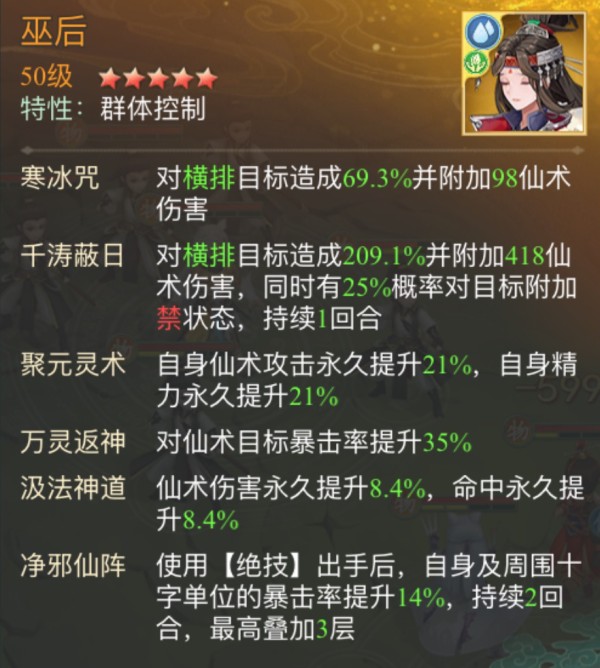 巫后放6号位,巫后技能对横排造成伤害,前期配合伙伴清理前排武林人士之后,绝技“千涛蔽日”可直接打在最后一排武林人士身上,并有几率对目标附加“禁”状态(本回合禁止使用绝技),可让最后一排武林人士不能释放绝技,提高伙伴的生存空间。