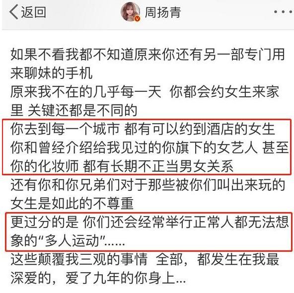 2020年4月23日,周扬青正式在个人社交平台上官宣与罗志祥分手的消息,千字长文曝两人分手原因:不是感情变淡也不是移情别恋,而是罗志祥一桩又一桩让人三观碎裂的渣男行径让这段长达九年的感情走向绝境。
