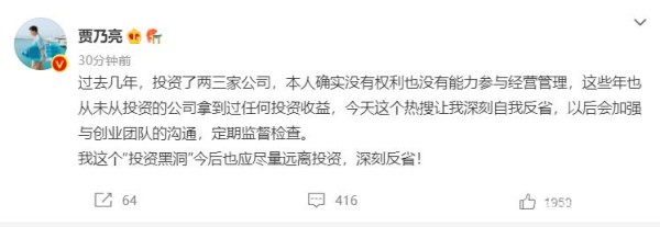 随后,贾乃亮在微博回应称:过去几年,投资了两三家公司,本人确实没有权利也没有能力参与经营管理,这些年也从未从投资的公司拿到过任何投资收益,今天这个热搜让我深刻自我反省,以后会加强与创业团队的沟通,定期监督检查。我这个“投资黑洞”今后也应尽量远离投资,深刻反省!