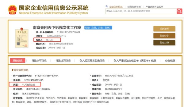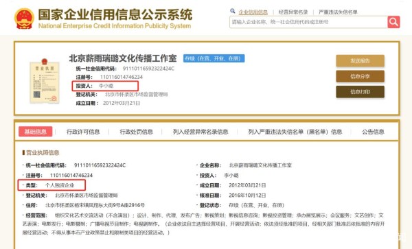 启信宝信息显示,该公司成立于2015年10月,实缴资本75万元人民币,贾乃亮全资持股的南京亮闪天下影视文化工作室认缴出资10万元,占股4%;李小璐全资持股的北京薪雨瑞璐文化传播工作室认缴出资10万元,占股4%。