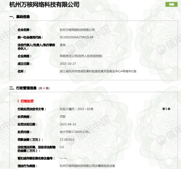 信用中国信息显示,杭州万核收取账外收入未按规定申报纳税。2017年1月至2021年4月,该公司通过法定代表人黄某的个人支付宝、银行卡分别取得收入2297443.20元(含税)、2226340.65元(含税),未入账,未按规定申报纳税;通过单位支付宝取得收入374847.29元(含税)未入账,未按规定申报纳税;另有部分收入未足额申报增值税。