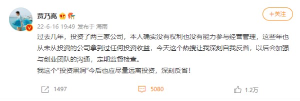 当天19点多,贾乃亮回应称,过去几年投资了两三家公司,没有权利也没有能力参与经营管理,这些年也从未从投资的公司拿到过任何投资收益,“今天这个热搜让我深刻自我反省,以后会加强与创业团队的沟通,定期监督检查。”