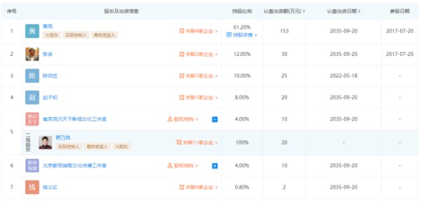 企查查显示,万核网络成立于2015年10月,法定代表人、大股东为黄亮。贾乃亮全资持股的南京亮闪天下影视文化工作室认缴出资10万元,占股4%。