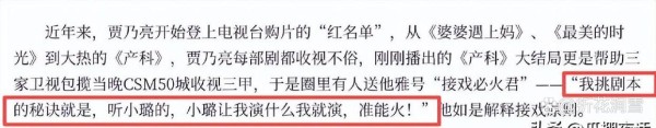 结婚后,贾乃亮的资源多了起来,从《婆婆遇上妈》、《最美的时光》到很火的《产科男医生》,贾乃亮有了一个“演戏必火”的说法。事业很成功的贾乃亮,毫不吝啬地夸奖老婆李小璐,他说:“我选剧本都听小璐的,小璐让我演什么,肯定会火。”