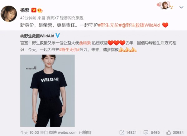 此外,在这两天杨紫又开启了一个新的身份,让许多观众感到特别惊讶,如今她也成了我国的“野生救援公益大使”,而她本人也在微博上表示,这次对她来说是一个全新的身份,也是一个新的荣誉,更是一种责任,需要与大家共同守护,所以让很多观众非常佩服。由于作为一名一线女演员,平时拍戏已经很不方便了,但是能在繁忙的时候参与到这些公益事业中来,也是很不容易的。