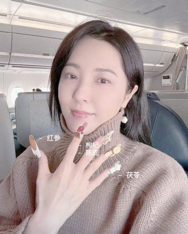 近日, 曾黎在飞机上展示了一款别致的 中药美甲,其中巧妙地融入了多种药材元素,令人眼前一亮。