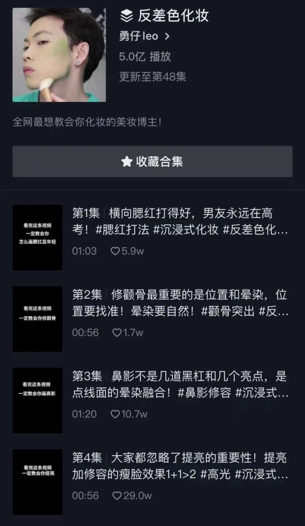 截至现在,“反差色化妆”系列视频已经更新至48集,播放量突破了5亿。视频中的教学范围从底妆到腮红、鼻影、修颧骨、提亮、遮泪沟等各个化妆环节全面覆盖,精准狙击了用户在化妆过程中遇到的诸多痛点,且所有的教学过程面面俱到且一目了然,勇仔的专业技能得以被展现得更加全面,也由此吸引了一批又一批的“学生”慕名前来学习。