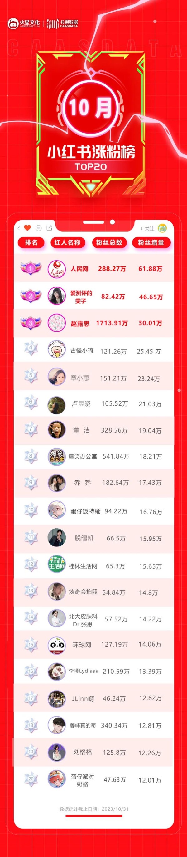 小红书10月涨粉榜已出,我们先来一起看榜: