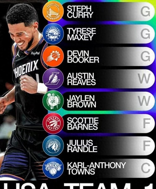 第一支美国队由勇士队的斯蒂芬·库里领衔,37岁的他场均仍能贡献27.4分3.7篮板3.7助攻,对阵马刺的两场比赛都轰下45+得分。 与他搭档后场的包括76人队的泰瑞斯·马克西(场均32.5分4.9篮板7.7助攻)和太阳队的德文·布克(场均28.4分4篮板7助攻)。