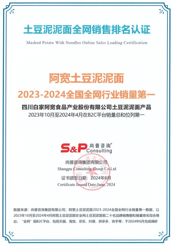 同时,阿宽土豆泥泥面也荣获了全国全网销量第一的认证。这个销量第一,是无数消费者、经销商和终端对阿宽品牌深度认可的有力证明。它代表着阿宽食品在产品研发和市场推广上的成功,也为整个食品行业树立了标杆。