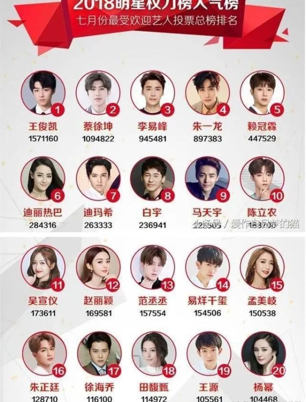 其中王俊凯以超出第二名50万的票数排在第一位,可以说是一骑绝尘。作为TFBOYS的成员之一,王俊凯长相帅气、能歌善舞因此粉丝数量是相当的多,而且在TFBOYS单飞后被很多人认为将会是发展的最好的一位。已经记不清这是王俊凯第几次霸占明星人气榜的月榜榜首了,王俊凯可以说是榜单上的常客。王俊凯可以说是包揽了今年人气榜的第一名。近几年TFBOY因为学习等原因,三人已经很少一起参加活动了。王俊凯上大学后,时间上比较宽松,是三人中最为活跃的一个,最近录制的《中餐厅》反响不错,吸粉能力杠杠的。