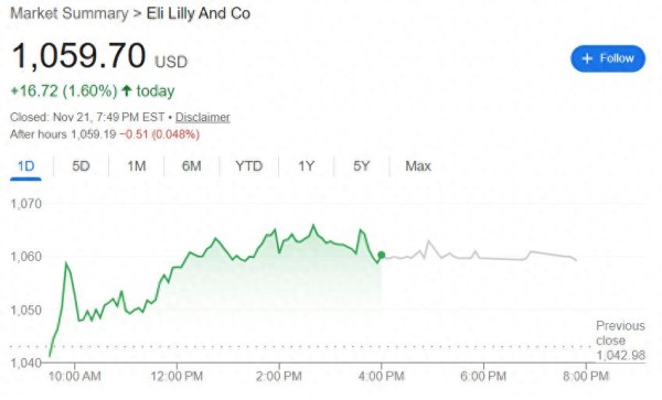 周五礼来美股股价收涨1.60%,今年已累计上涨近40%。公司市值突破1万亿美元,加入了科技七巨头以及巴菲特旗下伯克希尔·哈撒韦在内的万亿美元市值企业行列。