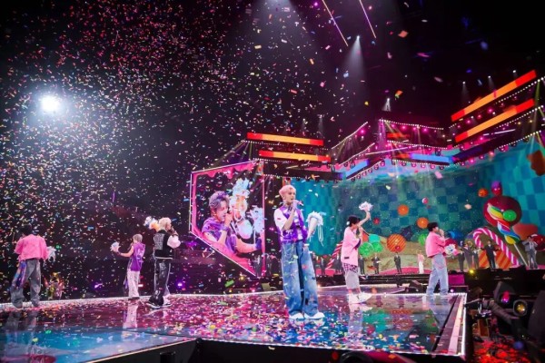 舞台两侧伫立着巨大的竖屏,像是手机直播间的无限放大版。台下此起彼伏的呼喊、五彩的灯光、精致的妆造,让人仿佛置身于一场偶像选秀的决赛现场。